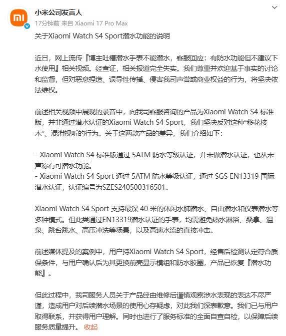 小米公司发言人微博今日发布关于Xiaomi Watch S4 Sport潜水功能的说明:股票配资指数网